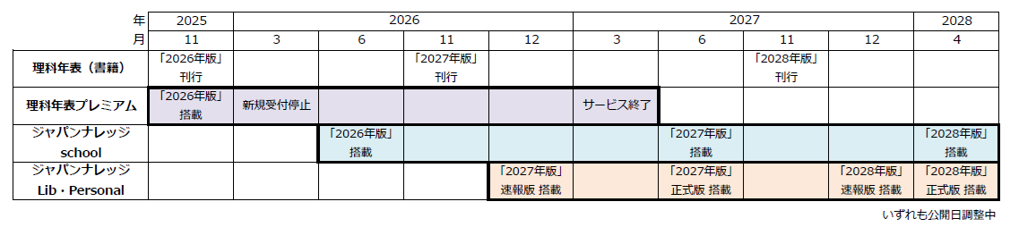 ・2026年度末より「ジャパンナレッジLib」にて、「理科年表2027年版」の単年度版データの速報版(紙面イメージを閲覧できる形式)を、さらに2027年6月より、データベース化された正式版(データダウンロード可能)を搭載予定です。