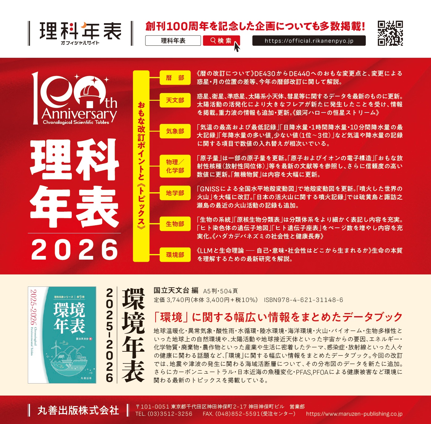 さらに、今年は1925年の創刊から100周年となりました。長い歴史で蓄積されたデータの変遷を見ることができるのも、本書の大きな魅力です。確かな正しいデータとして高い信頼性と歴史を誇る『理科年表』。よく利用していたという方も、初めて知ったという方も、この機会にぜひお手に取ってみてください。