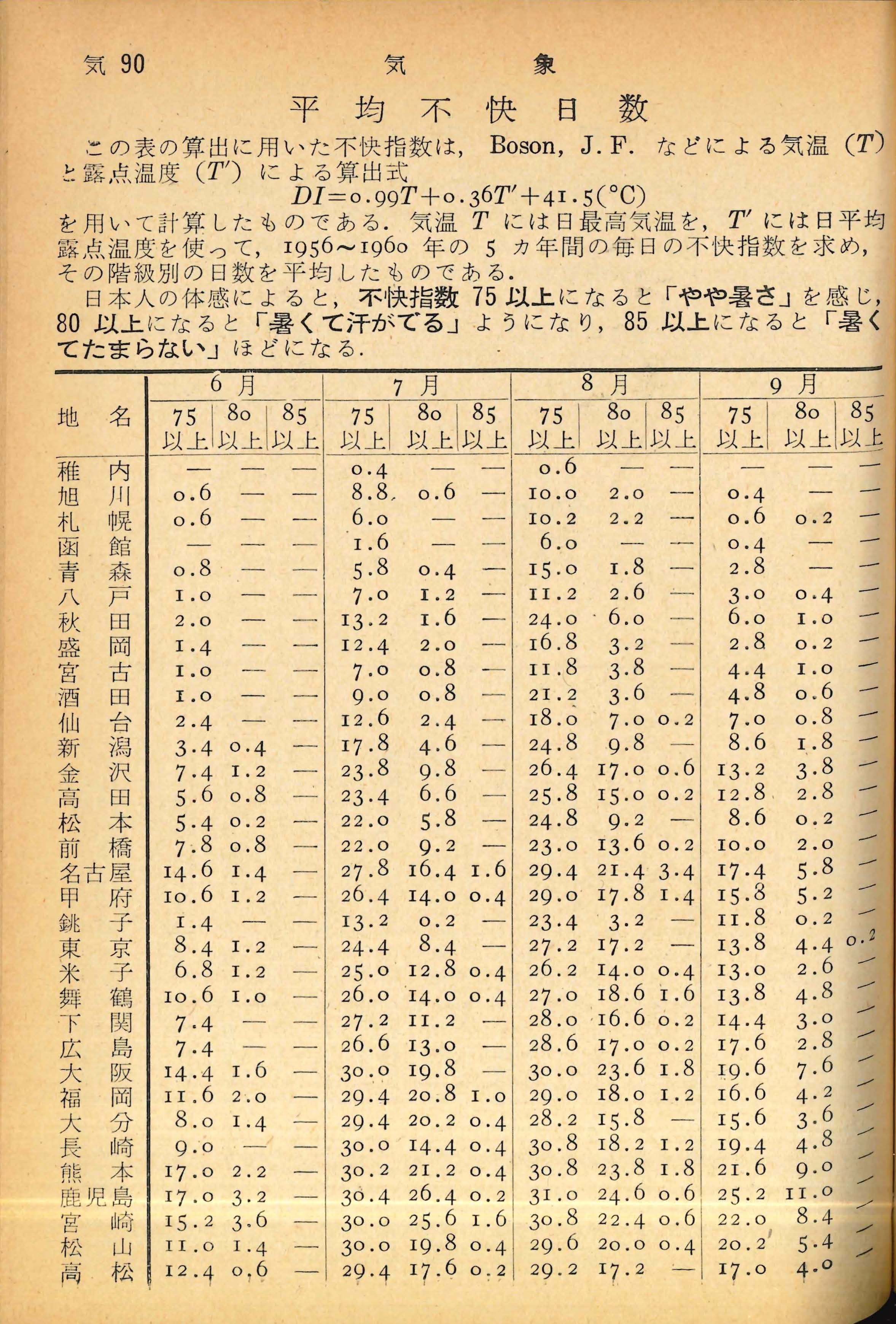 昭和38年版から平成13年版まで気象部には「平均不快日数」という項目があった。夏の蒸し暑さを数量的に表す不快指数を月毎にまとめてあり、この指数が75以上になると「やや暑さ」を感じ、80以上で「暑くて汗がでる」ようになり、85以上では「暑くてたまらない」ほどになると言われる。初掲載された昭和38年版を見てみると、例えば8月の東京は、やや暑さを感じる日が平均27.2日あり、暑くて汗がでる日が17.2日、暑くてたまらない日はなかったようだ。さて、気象庁の「2025年の猛暑日・真夏日などの日数」によれば、今年8月の東京は、猛暑日(日最高気温35℃以上)が18日、真夏日(30℃以上)が29日あり、個人差はあろうがほぼ毎日汗が出て、暑くてたまらなかったのではないだろうか。10月も半ばを過ぎて、ようやく秋めいて過ごしやすくなったが、時候の挨拶が今の季節感に合わなくなってきている。