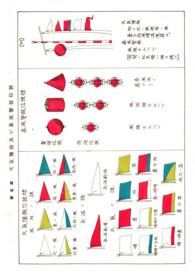 理科年表は原則1色刷りだが、かつてカラー刷りの図が掲載された時期があった。気象部に「天氣豫報及ビ暴風警報信號」というカラー図が初めて掲載されたのが、第6冊目となる「昭和5年版」(その後、「昭和18年版」まで掲載された)。この図は気象信号標識と呼ばれ、天気予報や注意報、警報などを示した形象標識の一覧である。「風向の予報を表す三角旗、天気の予報を表す方旗及び寒暖の変化の予報を表す長三角旗の三種」の旗を組み合わせて、その日の天気予報を旗竿に吊るし、市民に知らせていたそうである。「天氣ノ旗」を見てみると、晴れは白で、曇りが赤、雪は緑となっているが、色分けを理解していないと間違えてしまいそう(晴れが赤、曇りが白のほうがイメージしやすいかも?)。折しも昨年2025年は、気象庁の前身である東京気象台が気象業務を開始してから150周年であり、その間、予報技術は格段に進歩し、いまやスマホのアプリから数分後のゲリラ雷雨の発生までわかるようになった。小学生の頃、私が通っていた小学校ではプールに入れる日は青旗、入れない日は赤旗が掲げられたので、今日は何色の旗が上がるのか一喜一憂した記憶を思い出した。いまも天気予報の旗が上がったら楽しいかも。