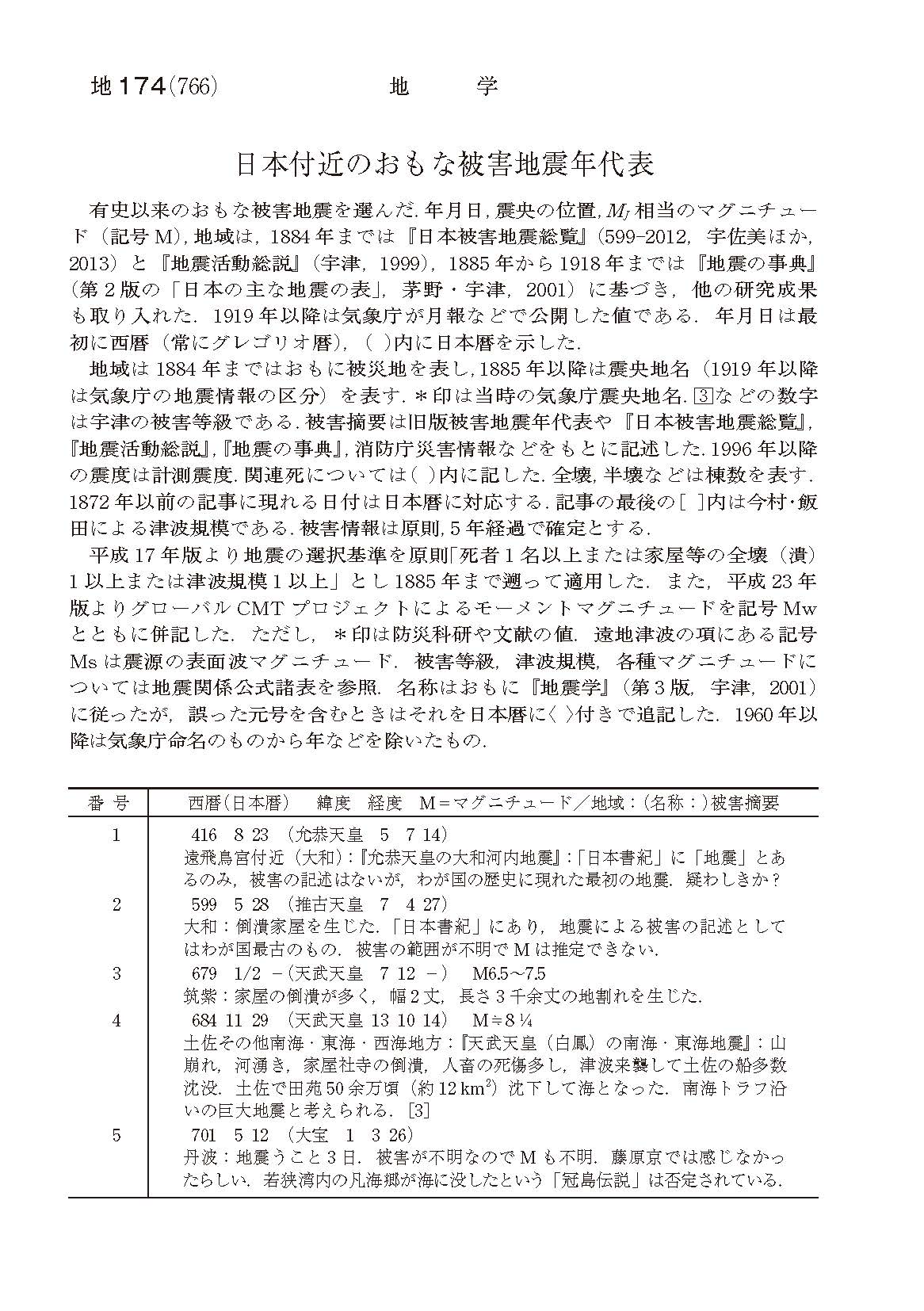 毎年1月のこの時期になると、諏訪湖の「御神渡り」が話題になる。諏訪湖が全面結氷し、その氷が割れてせり上がったすがたは神が渡った跡「御神渡り」だと考えられ、神事とされてきた(全面結氷がない年は明海〔あきうみ〕となる)。ただ、近年は御神渡りが見られない年も増え(2018年2月以来、出現していない)、ここ数年は、今年こそは御神渡りが見られるかどうかが話題になっている。この御神渡り/明海についての最も古い記録は580年以上前の室町時代中期1443(嘉吉3)年のものとされている。また、1683(天和3)年から記録されている、八剱(やつるぎ)神社の「御渡(みわたり)帳」は世界最古の気象観測記録ともいわれ、科学雑誌ネイチャーにも取り上げられている。古い時代に起こった自然現象は、文献などの記録や伝承として残された情報が大きな手掛かりになるが、当時に記録をし、それが現代まで残っているのは奇跡だと思う。じつは理科年表にもそのような表が掲載されているのをご存じだろうか。地学部「日本付近のおもな被害地震年代表」には、有史以来の被害地震がまとまっており、観測記録のない古い時代については当時の文献情報を基にしている。この表は、416年8月23日(允恭天皇5年7月14日)から始まる。
